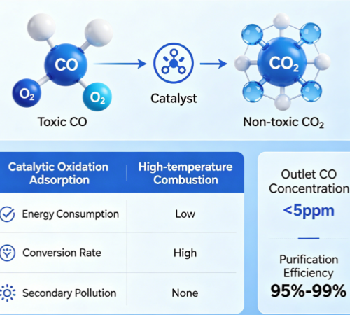 Catalytic oxidation of carbon monoxide is a gas purification technology based on catalytic reactions. Its core principle involves utilizing a catalyst to facilitate a redox reaction between toxic carbon monoxide (CO) and oxygen (O₂)—without the need for high temperatures or open flames—thereby achieving the targeted conversion of CO into non-toxic and harmless carbon dioxide (CO₂) and effectively accomplishing the removal and purification of carbon monoxide. Compared to traditional CO treatment technologies—such as physical adsorption and high-temperature combustion—this technology offers significant advantages, including low energy consumption, high conversion efficiency, and the absence of secondary pollution. Consequently, it is currently the preferred technology for the deep purification of CO in both industrial and residential sectors; it can consistently reduce outlet CO concentrations to below 5 ppm, achieving purification efficiencies ranging from 95% to over 99%.